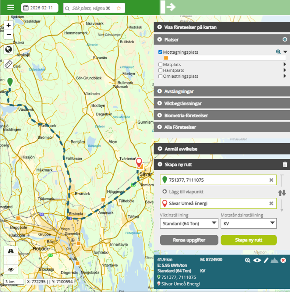 Bilden visar en framräknad rutt - grönstreckad linje - för ett standarfordon (64 ton) från ett avlägg i skogen till en mottagningsplats i Svävar norr om Umeå. Sträckan är 41,9 km och energivärdet 5,95 kWh/ton